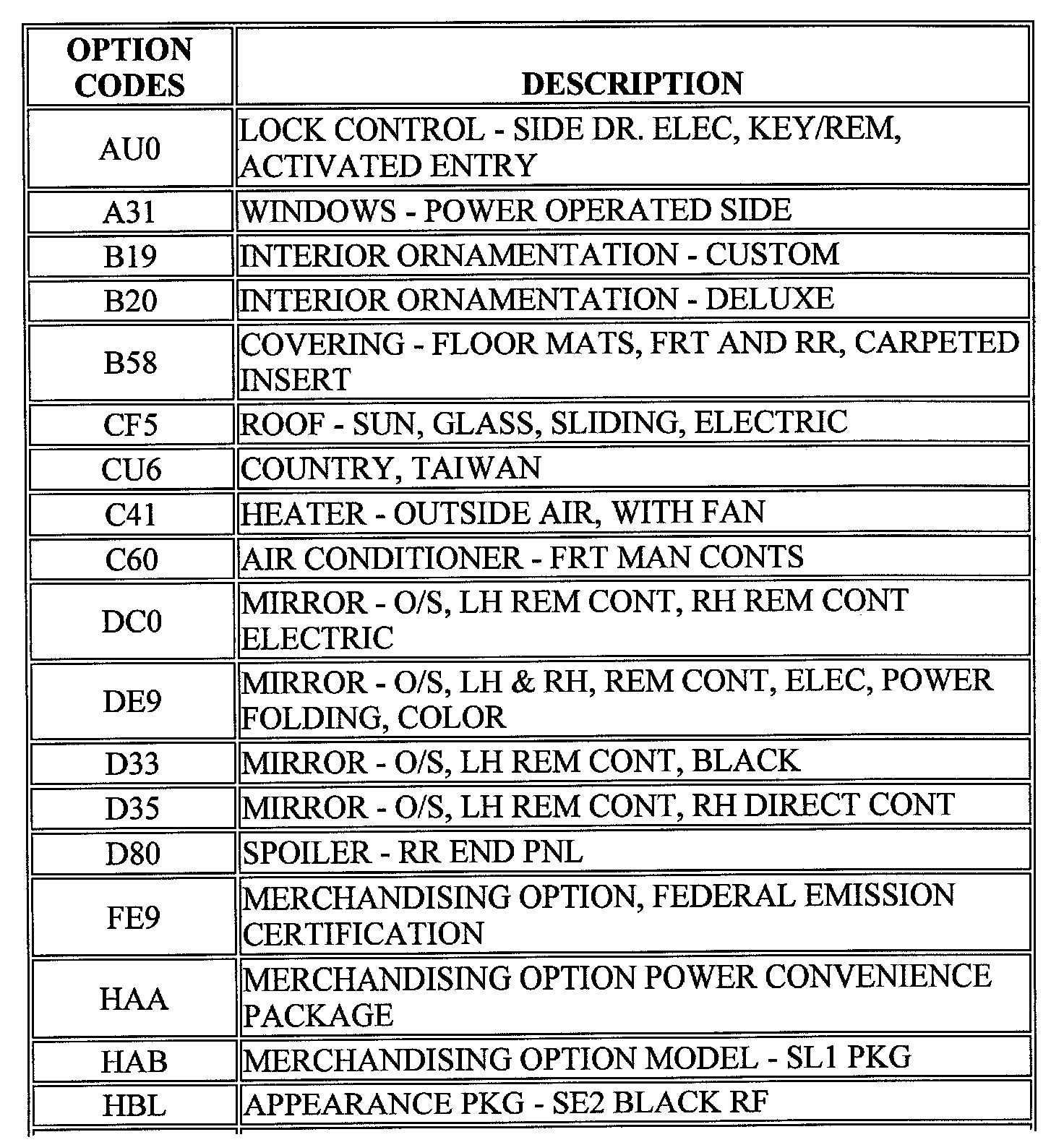 The following table provides the description of the Regular Production Option (RPO) codes that are available on the vehicle. The vehicle's RPO list is printed on the Service Parts Identification Label.