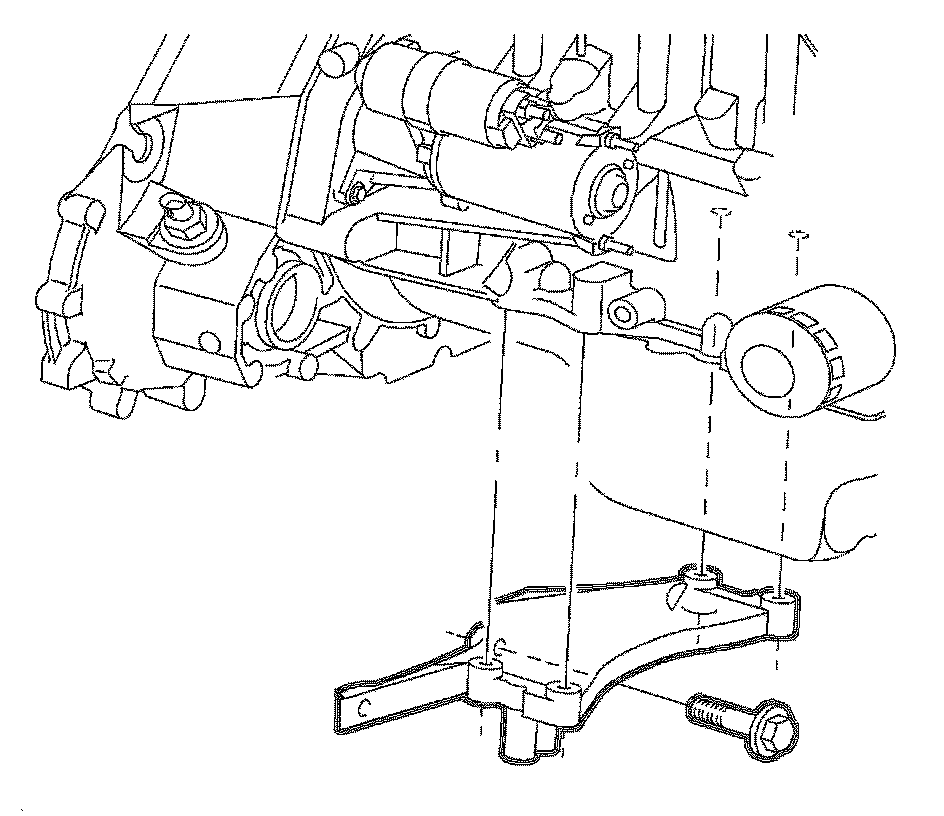 33. Place a 1/2 in. x 1 in. x 3 in. block of wood under the axle shaft. Remove intake manifold support brace (DOHC [LL0]) and three axle shaft bracket support bolts and allow bracket to rotate rearward. It may be necessary to lift the engine slightly to allow for clearance between the drive axle shaft bracket and starter support bracket.