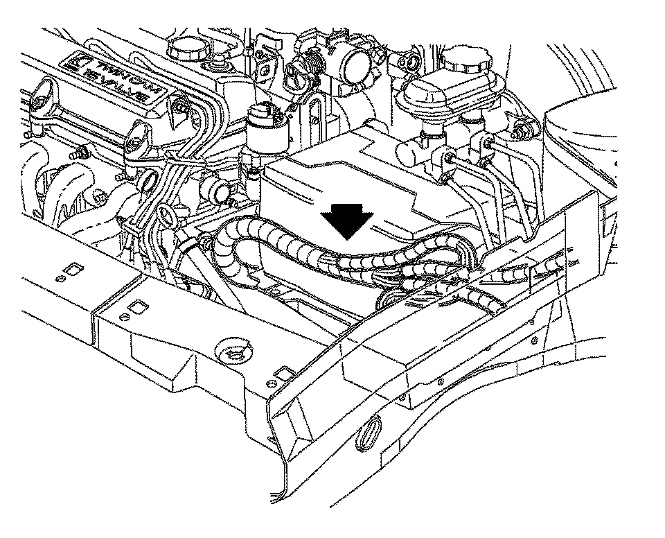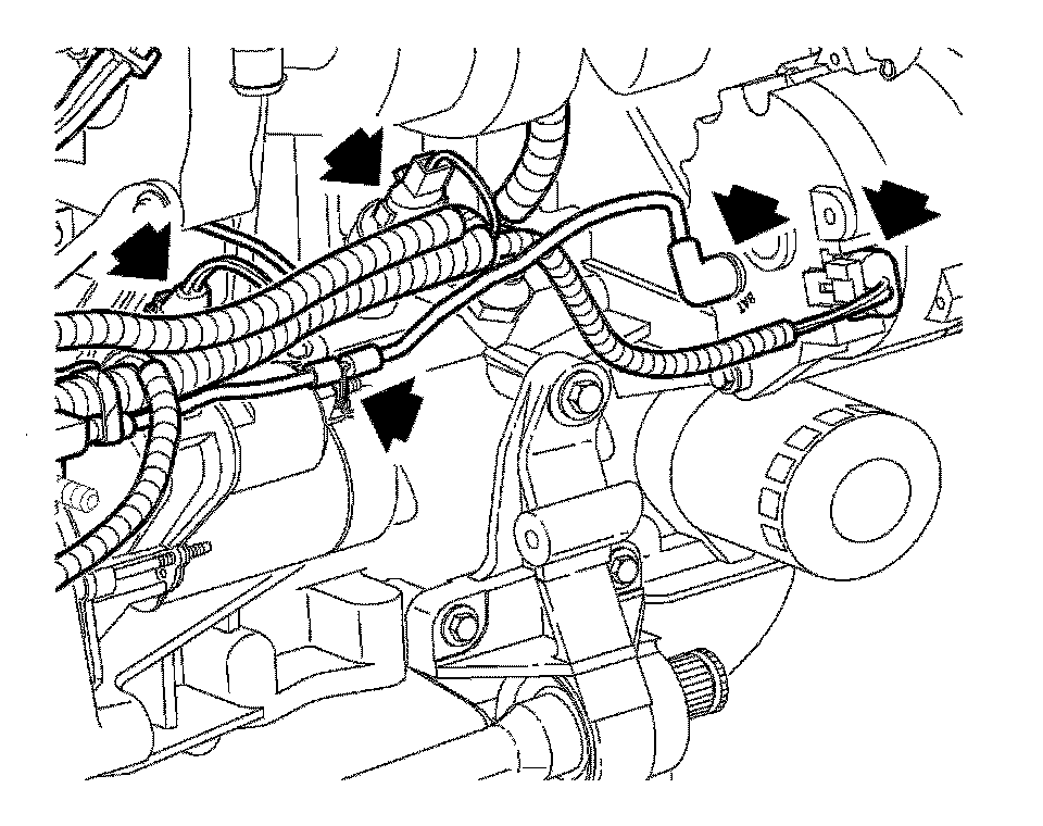 24. Carefully remove the electrical harness from the engine. Lower the vehicle enough on the hoist to lay the electrical harness on top of the underhood junction block and battery cover.