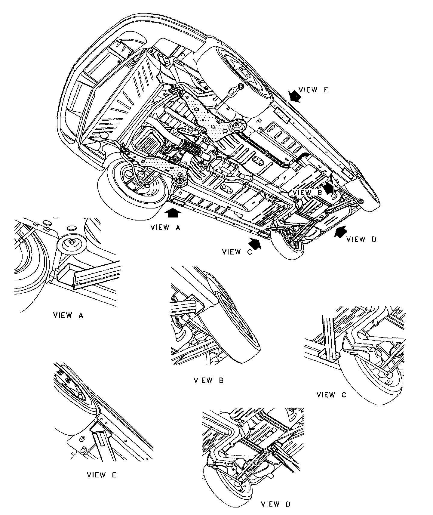 When lifting with a frame contact hoist, lift the vehicle on the side frame directly behind the front tires and in front of the rear tires (Views A, B, C, E of figure).
