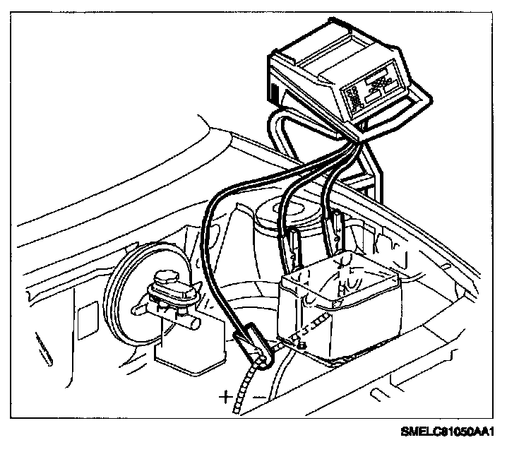 1. Turn the Starting and Charging System Tester SA9154Z-A On. Connect large red tester cable to battery positive (+). Connect large black tester cable to battery negative (-). Place gray inductive current pick-up around battery positive (+) cable. Make sure that the arrow on the gray inductive current pick-up is pointing toward the starter motor solenoid.