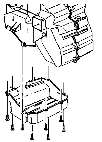 32. Install blower motor housing. Housing rib must fit into slot in case. Snap left and right clips into place and install screws.