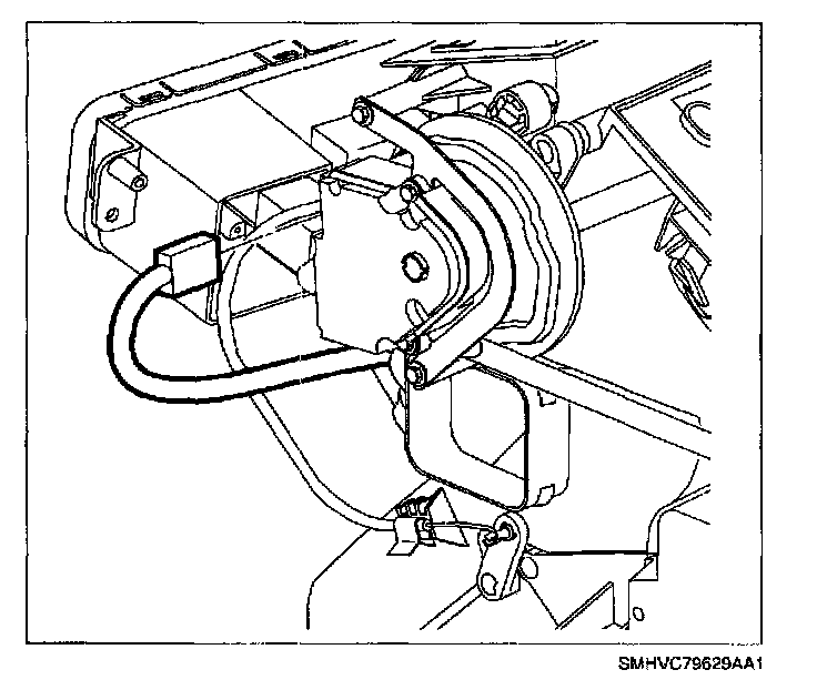 25. Install temperature door cable eyelet over temperature door lever. Do not install housing into retaining clip at this time.