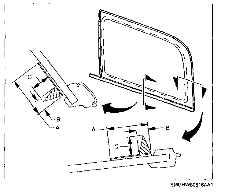 1. If quarter glass is to be reused, mark location using masking tape or a grease pencil with relationship to roof outer-drip rail and quarter panel. During installation, marks can be aligned to guide glass to desired position.