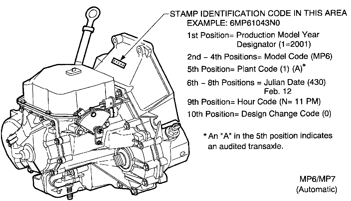 TRANSAXLE BUILD DATE CODESSaturn transaxles have coded manufacturing date stamps to aid in identification. The transaxles use a ten digit identification code to designate not only the time, day and year, but also model code, production plant and a design change code. The day is designated by the Julian date.