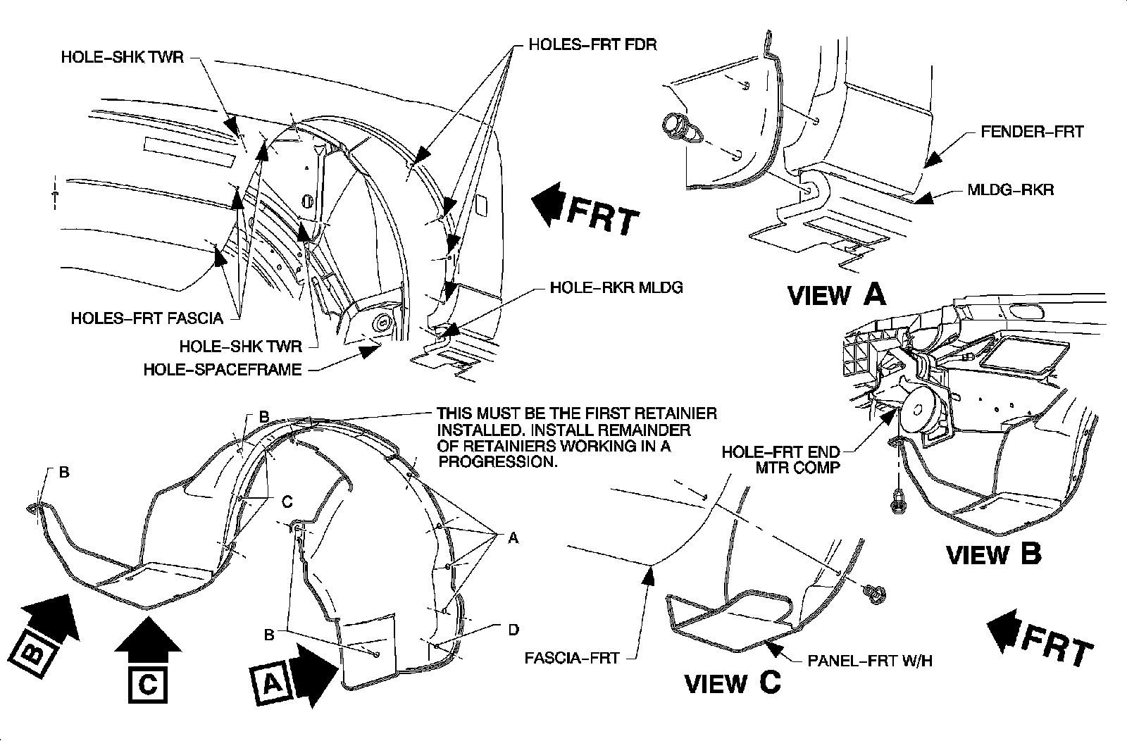 1. Remove the retainers attaching the wheelhouse panel to the front fascia.
