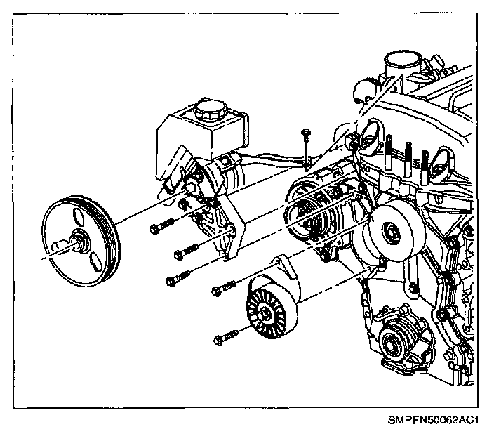 23. Remove upper power steering pump bracket attachment bolts and position pump next to the right-hand front of dash panel, away from the cylinder head and intake manifold. Refer to "Power Steering Pump" removal procedure in the Steering.
