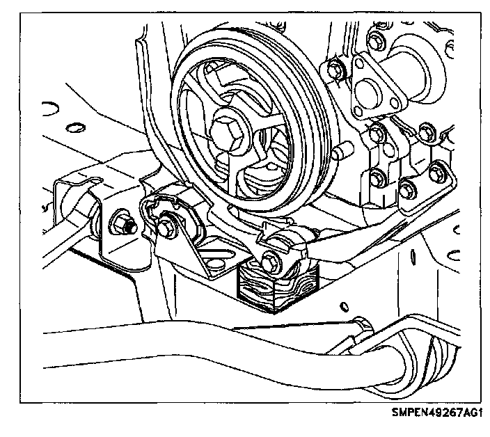 NOTE: To prevent engine front cover and mount damage, the three front engine mount-to-front cover nuts must be tightened down uniformly.