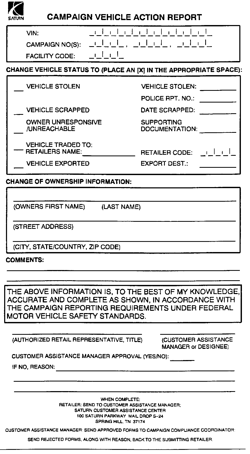 A copy of the Campaign Vehicle Action Report is shown for your reference. Additional copies can be ordered from Saturn Publications (1-800-828-2112, prompt 3, Item # S0397050). All changes to campaign responsibility will be reflected in your next Unfixed VIN Report.