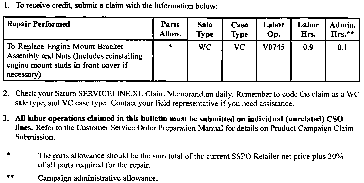 A pre-shipment of engine mount bracket assembly(s) and engine mount nuts required to perform this campaign has been automatically sent to involved Retailers from Saturn Service Parts (SSPO). These initial parts shipments are to aid the Retailers in campaign preparation and will ensure minimal customer inconvenience.