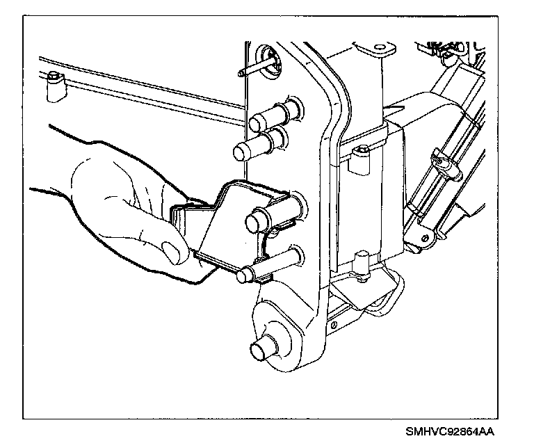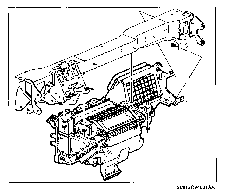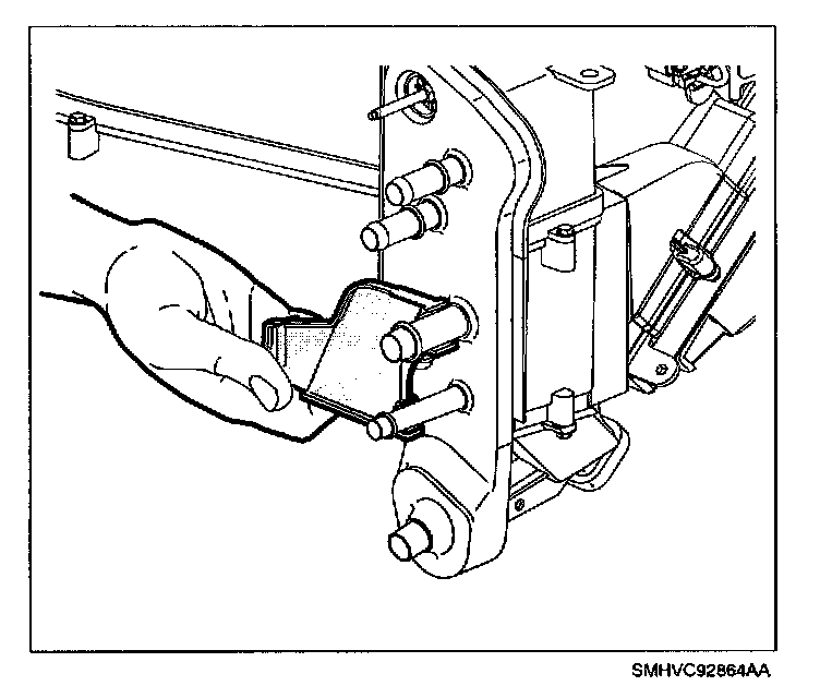 11. Grasp heater core at end tanks and remove (spraying perimeter of heater core seal with a soap and water mixture will ease removal).