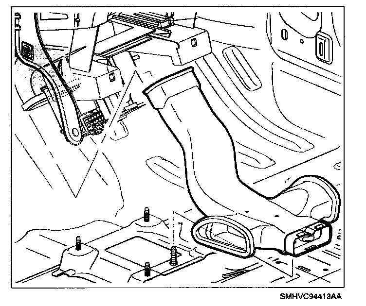 5. Push up on HVAC module at blower motor area while tightening right side HVAC module to cross car beam fasteners (to seat screen assembly/fresh air seal).