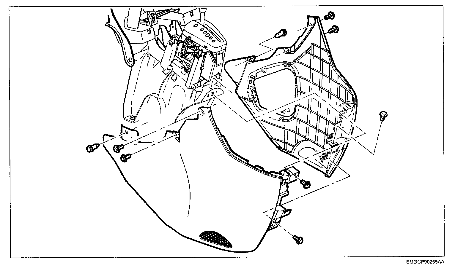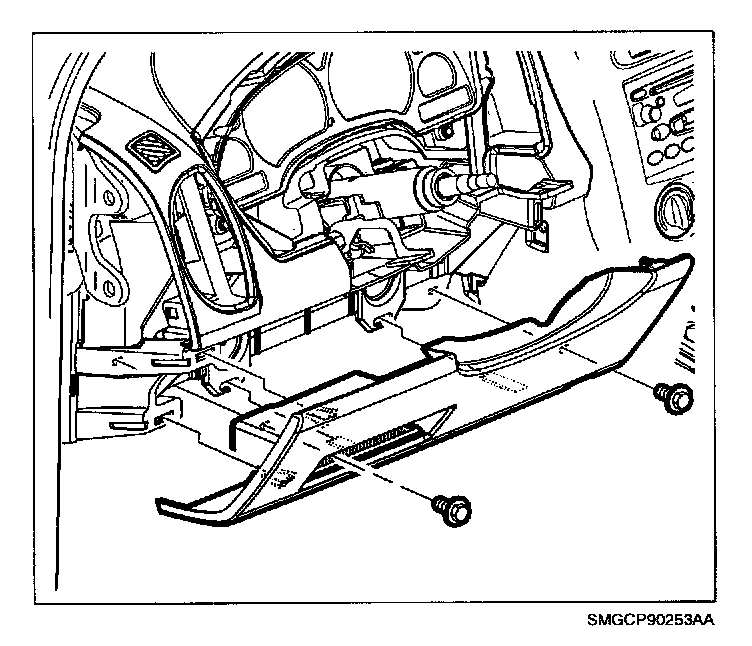 53. Install knee bolster by aligning retention clips with corresponding slots in retainer and snapping into place by applying light force at clip locations. Install screws.