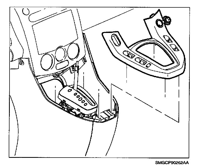 49. Install front edge of horseshoe bezel first over shifter assembly making sure to engage alignment pins and front edge tabs with corresponding slots at bottom of radio bezel, clear wires and lower back edge snapping into place by pressing down.