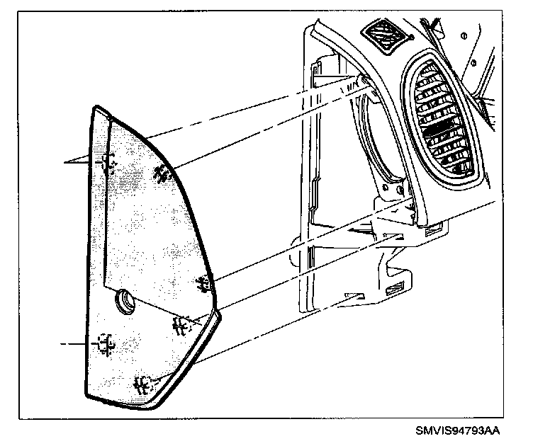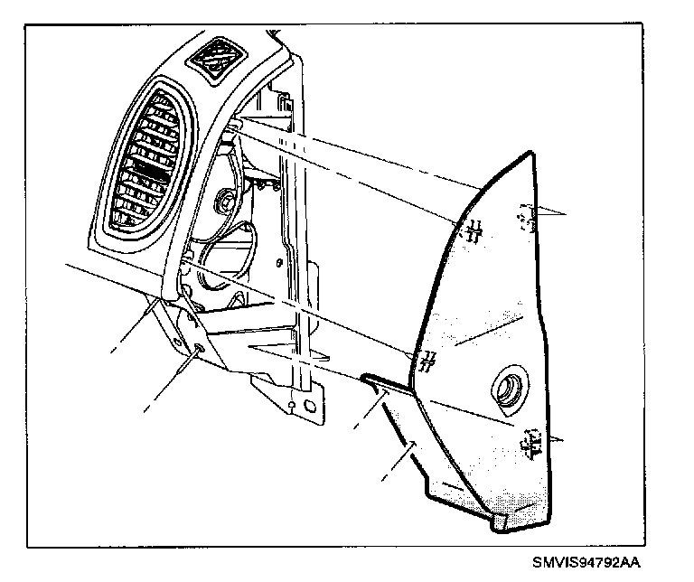 52. Connect I/P harness to door jamb switch and install left end panel by inserting tabs at back of panel with corresponding slots in I/P top cover and snapping into place by applying light force at clip locations.