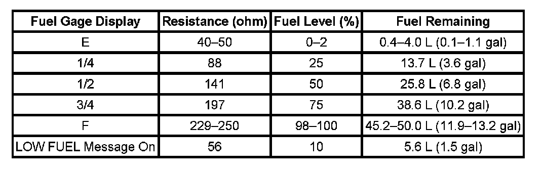 The information in this table is intended for use with the J 33431-C Signal Generator and Instrument Panel Tester. The fuel level sensor values represent the test values to be used on the Signal Generator to drive the fuel gage display to the indicated positions. Vehicles that require more than one fuel level sensor calculate gage position from many possible resistance combinations of fuel levels between the two tanks. Therefore, the values in the table may not correlate directly to readings taken from the vehicle primary or secondary sending units.
