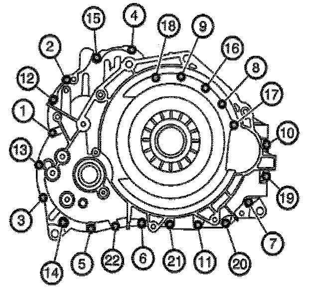 Do not reuse the torque converter and differential housing bolts after they have been removed. Discard the bolts and replace them with new service bolts (P/N 24228273). Refer to the illustration for location of the 22 bolts in the required tightening sequence.