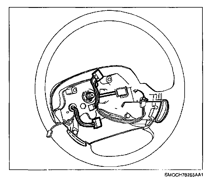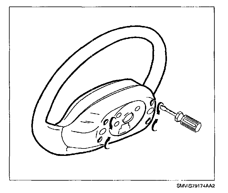 41. Remove inflator module by inserting a stubby flat blade screw driver into the triangle shaped hole in rear steering wheel shroud.