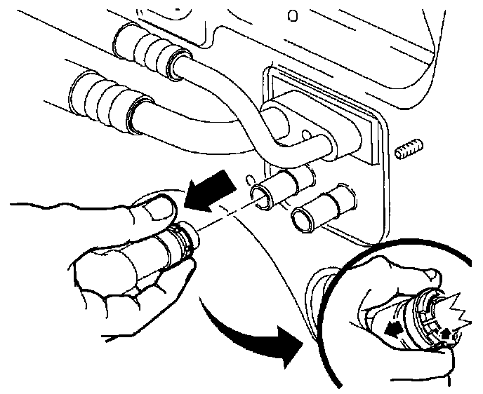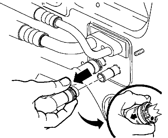 5. Remove heater inlet hose from heater core pipe by depressing quick connect collar tab, located at 6 o'clock, and pulling collar (black) toward front of vehicle and then pull quick connect off of heater core pipe.