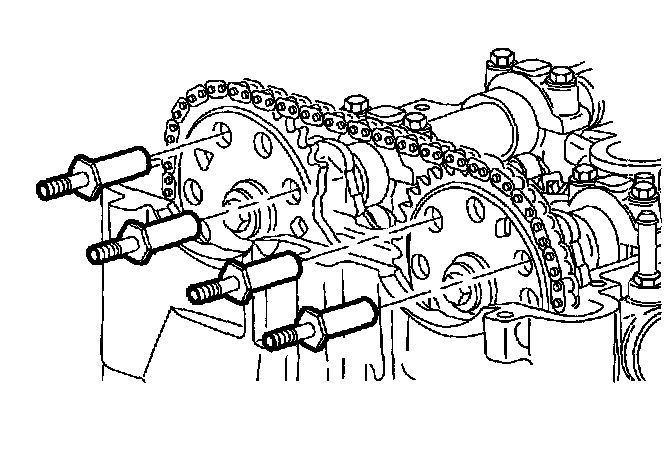 IMPORTANT: When sliding timing chain and sprockets onto guide pins, be sure timing chain is positioned properly on adjustable and fixed guide or guide damage will occur. Care should be taken when removing camshaft sprockets from camshafts.