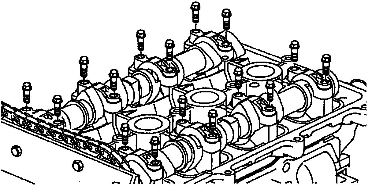 14. Install all bearing caps except for front cap and rear intake camshaft cap (if serviced). Tighten down bearing cap uniformly.