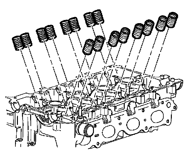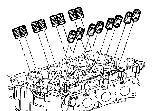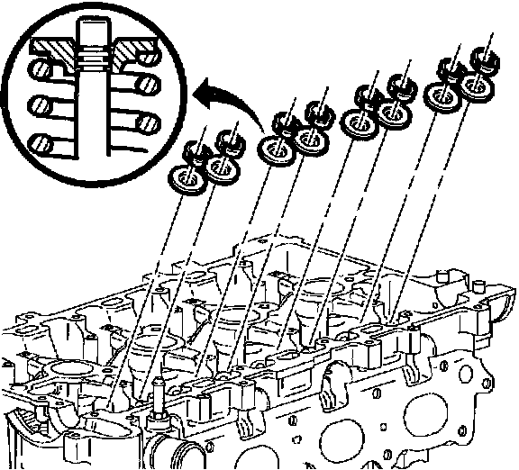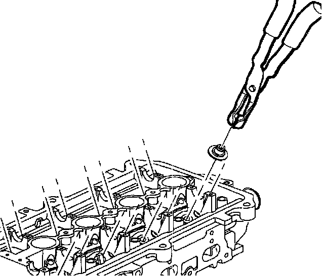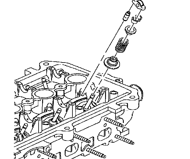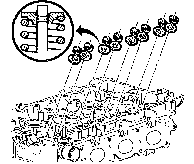 NOTICE: If valve stem seals are removed, they must be discarded. The valve stem lock groove will cut the seal's lip during removal. Use extreme care not to damage valve stems when installing retainers.