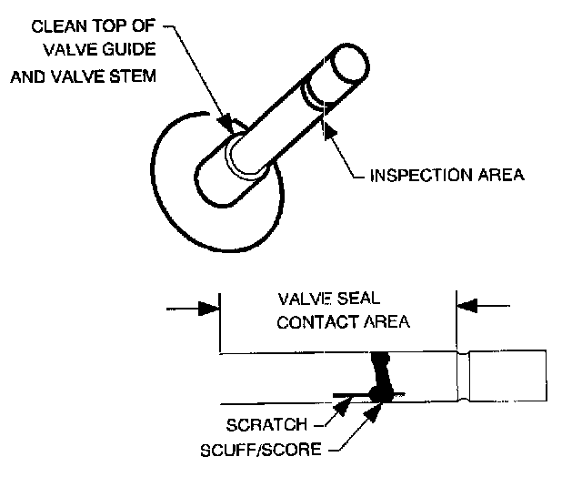 1. Inspect valve stem for scratches, scores, and scuffs. Spray valve stem and guide with clean lubricating oil to remove any debris that may be present on valve stem or top of guide.