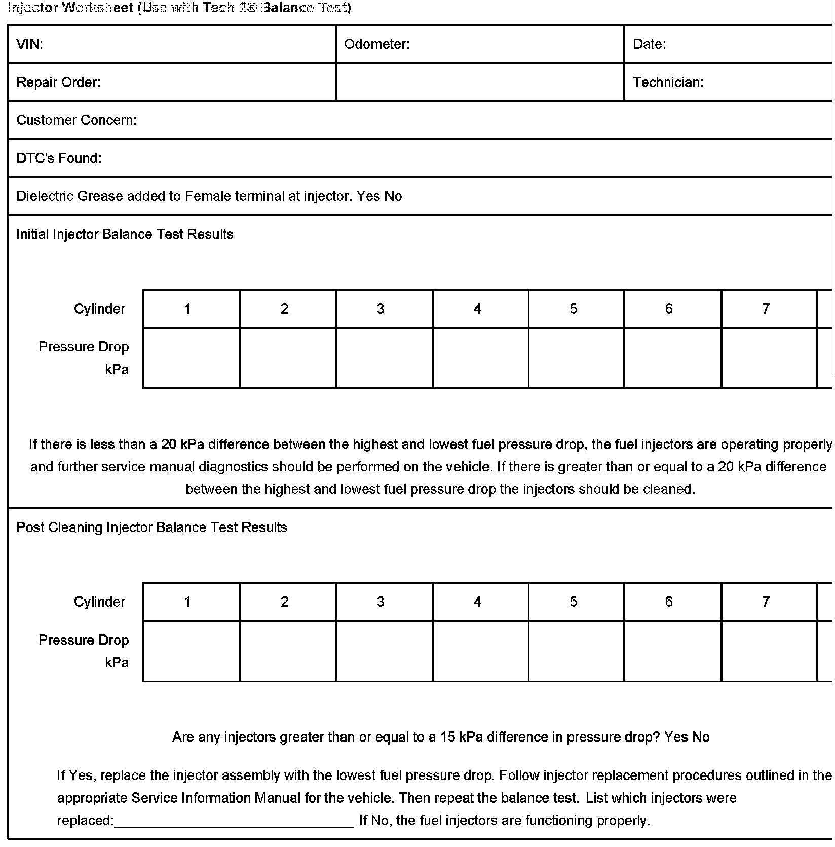 Injector Worksheet (Use with Tech2(R) Balance Test)