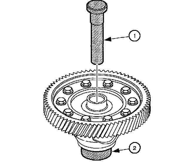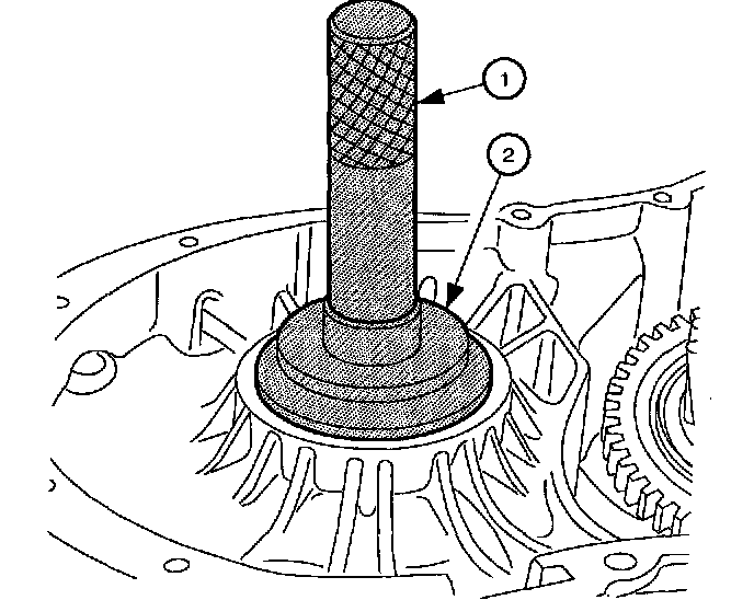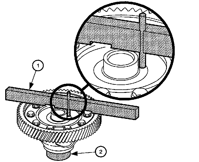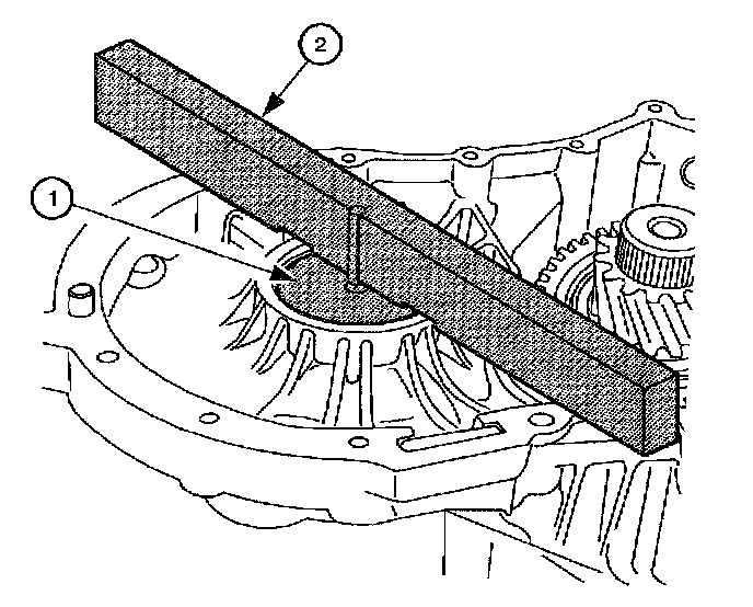 24. Insert Gauge Pin J44388-3 (1) through center of differential until it rests firmly on Gauge Installer J44388-4 (2).