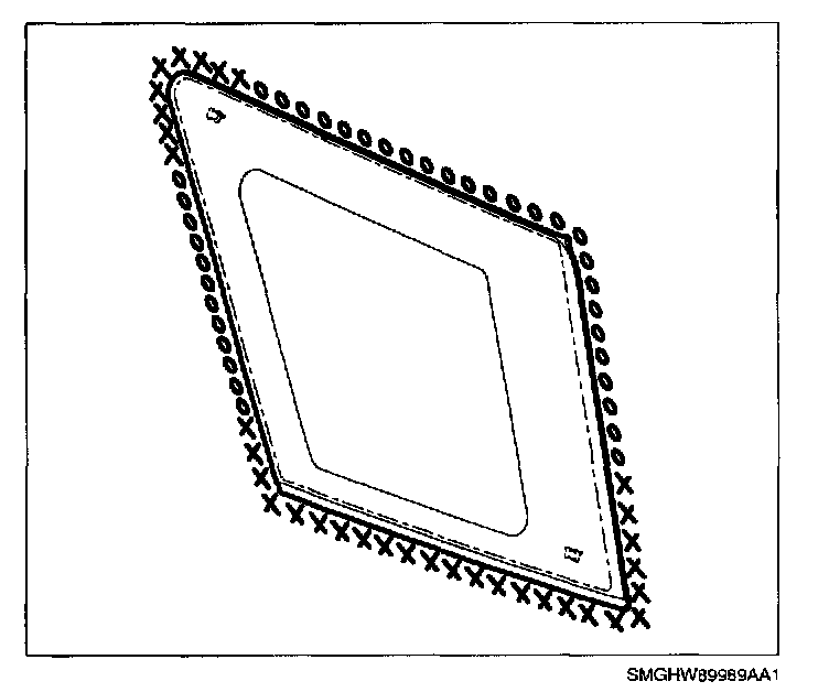 1. Remove old urethane with a new razor knife, leaving a thin film (approximately 1-2 mm [0.044).08 in.]) around the perimeter of quarter window opening. Any gaps in urethane film must be primed using glass prep primer (Clean #1) and glass primer (Black #2).