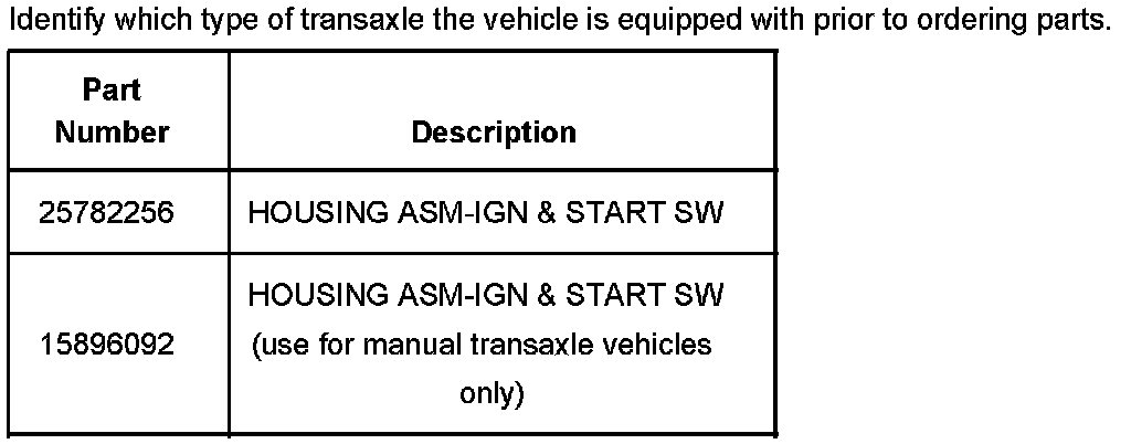 The purpose of this bulletin is to inform Saturn retailers of a new ignition start switch housing, P/N 25782256, which does NOT have a steering column lock bolt. This new component is recommended for use when servicing (replacing) the ignition start switch housing on all 2002-2007 Saturn VUE vehicles equipped with automatic transaxles.