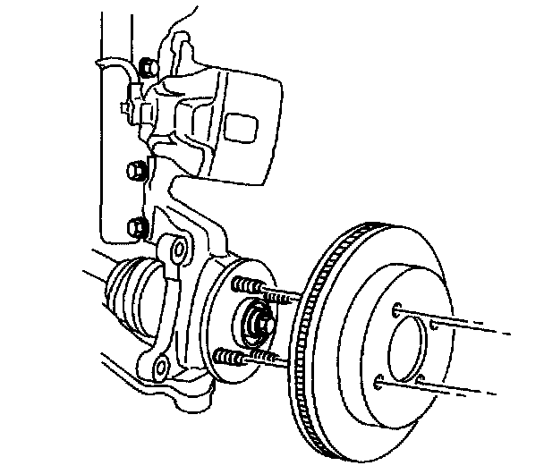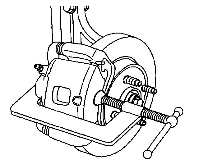 Notice: Support the brake caliper with heavy mechanic's wire, or equivalent, whenever it is separated from it's mount and the hydraulic flexible brake hose is still connected. Failure to support the caliper in this manner will cause the flexible brake hose to bear the weight of the caliper, which may cause damage to the brake hose and in turn may cause a brake fluid leak.