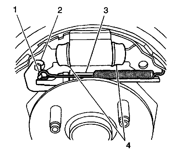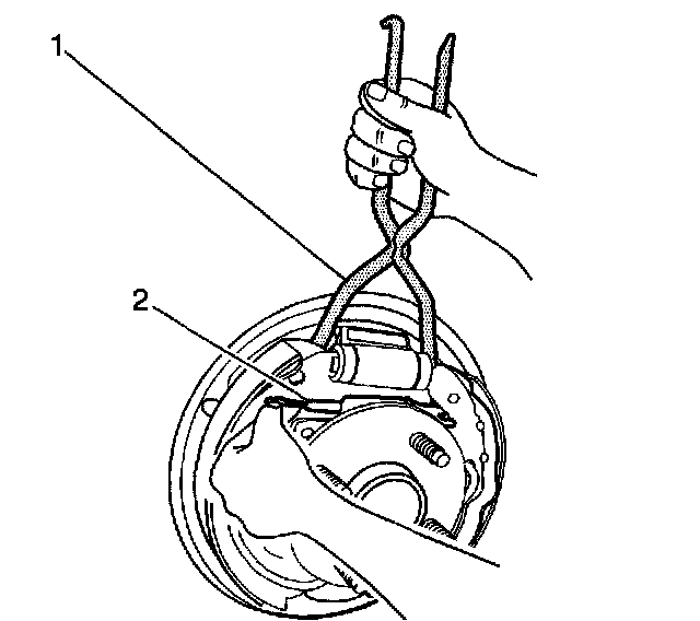 4. Remove the adjuster spring (1). Disengage the adjuster spring hook end from the tab on the adjuster actuator lever (2), then release the spring from the brake shoe web hole.
