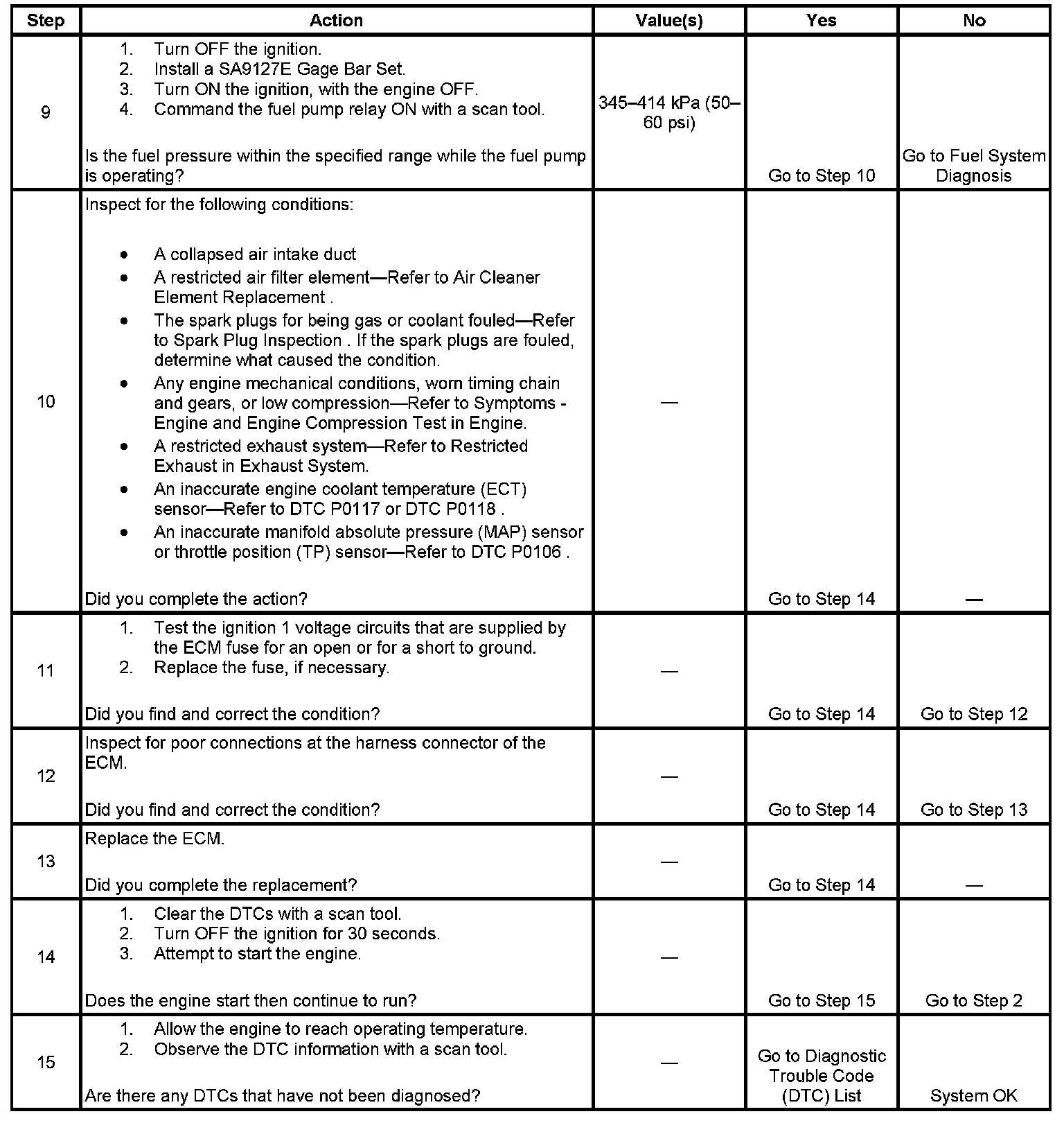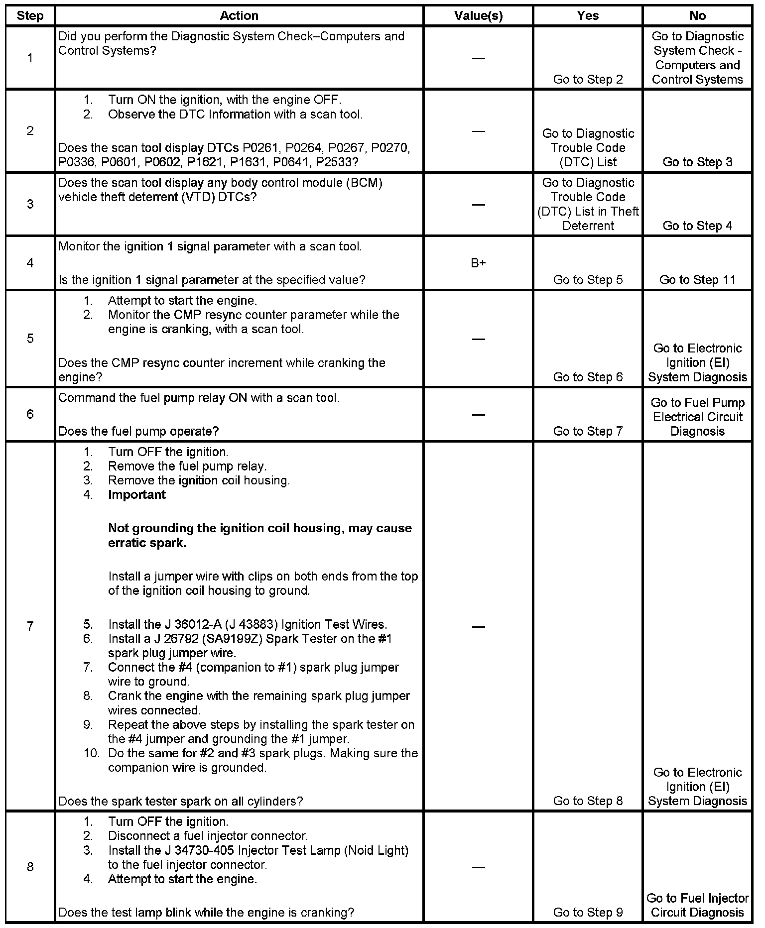 The Engine Cranks but Does Not Run diagnostic table is an organized approach to identifying a condition that causes an engine not to start. The Engine Cranks but Does Not Run diagnostic table directs the service technician to the appropriate system diagnosis.