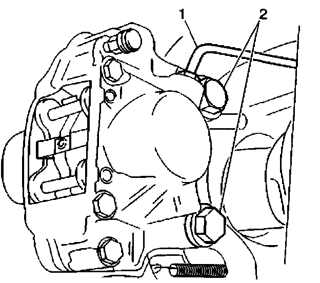 1. Remove the disc brake caliper bolts (2). Refer to Brake Caliper Replacement - Rear.