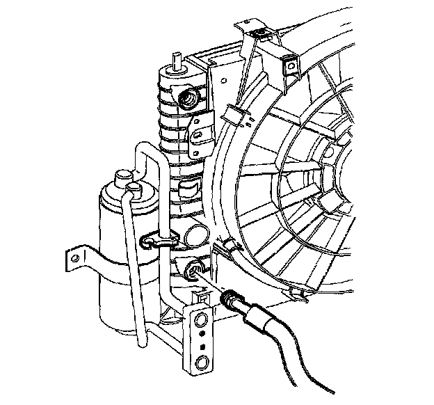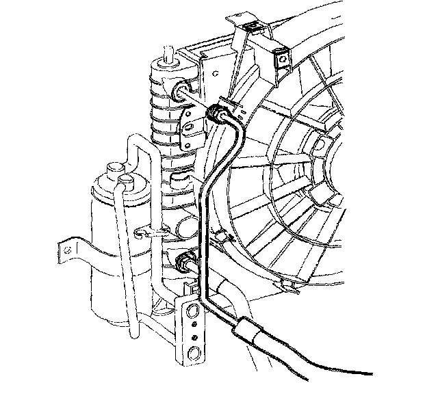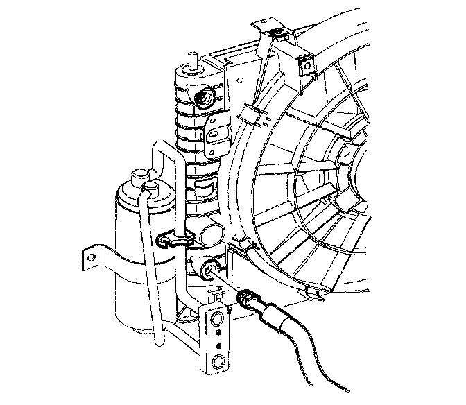 17. Remove the cap from the upper transmission oil cooler line. Install the line into the end tank retainer and snap into place.