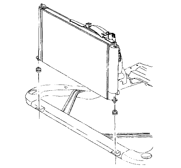 2. Install the radiator lower mounting pins to the rubber mounts.