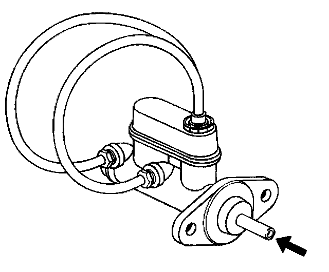 7. Using a smooth, round-ended tool, depress and release the primary piston as far as it will travel, a depth of about 25 mm (1 inch), several times. Observe the flow of fluid coming from the ports.