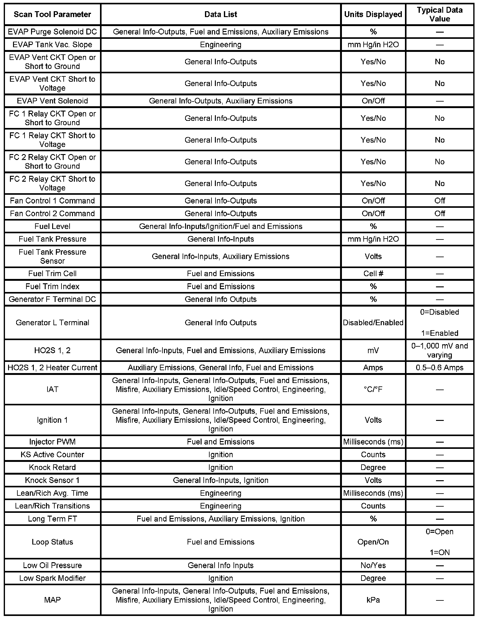 The engine Scan Tool Data List contains all engine related parameters that are available on the scan tool. The list is arranged in alphabetical order. The parameters in the Typical Scan Data values column represent values that would be seen on a normally running engine.