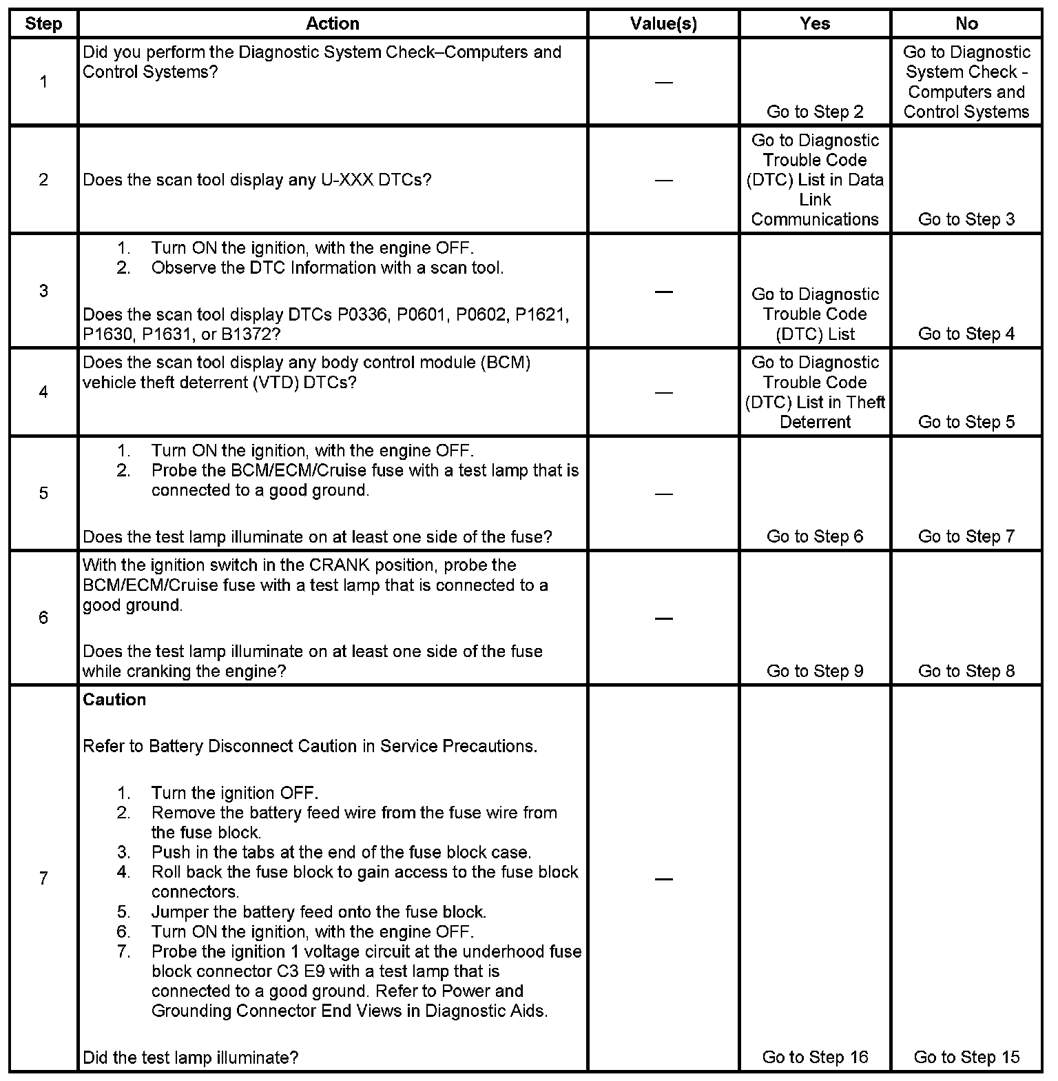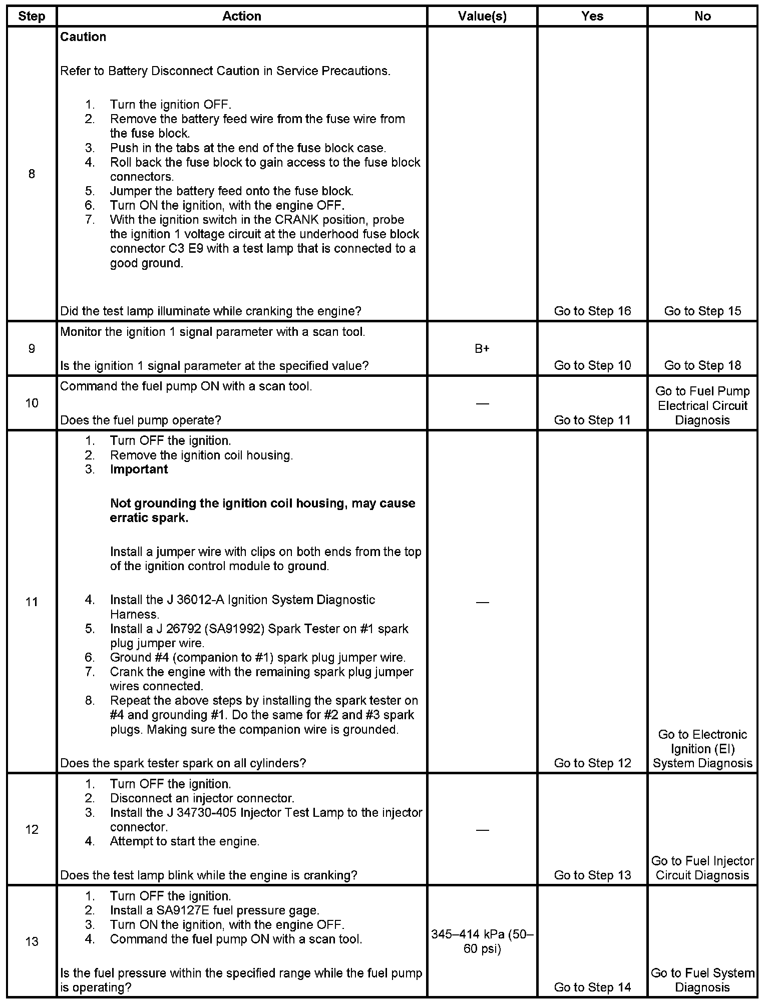 The Engine Cranks but Does Not Run diagnostic table is an organized approach to identifying a condition that causes an engine not to start. The Engine Cranks but Does Not Run diagnostic table directs the service technician to the appropriate system diagnosis.