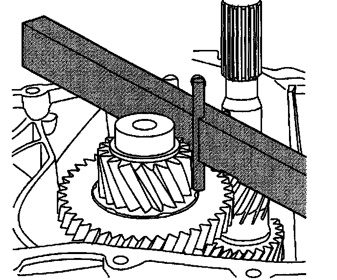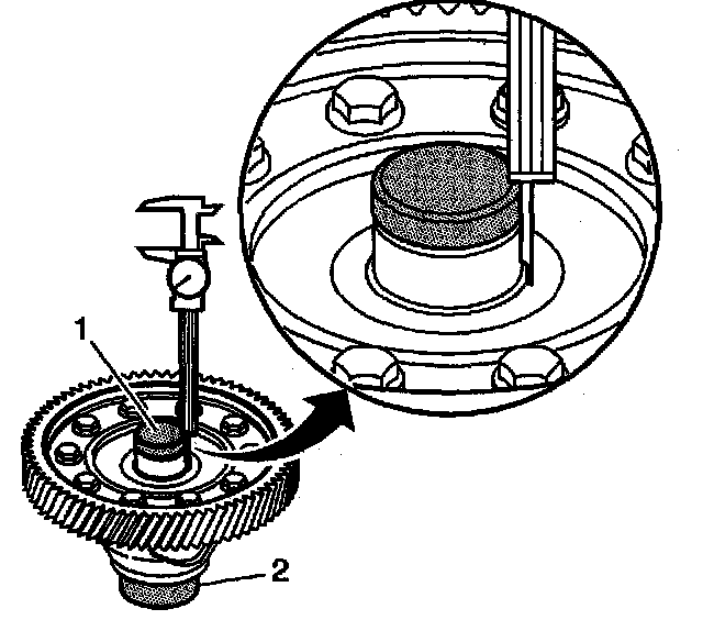 26. The distance from the top surface of the J 44388-3 (1) to the land of the right differential side bearing shim is measured and recorded (measurement F).