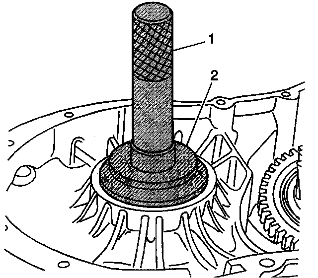 9. Make sure the left differential bearing race is fully seated into the transaxle case using the J 7079-2 (1) and the J 44385 (2).
