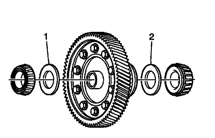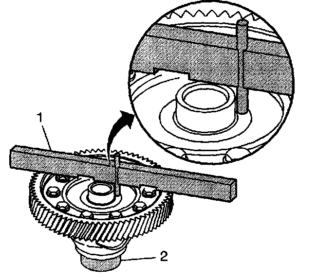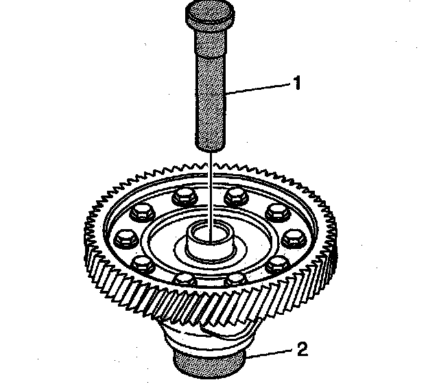 25. Insert the J 44388-3 (1) through the center of the differential until it rests firmly on the J 44388-4 (2).