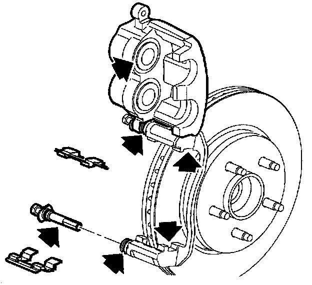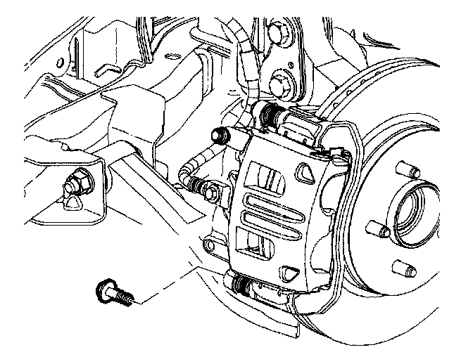 Notice: Support the brake caliper with heavy mechanic's wire, or equivalent, whenever it is separated from it's mount and the hydraulic flexible brake hose is still connected. Failure to support the caliper in this manner will cause the flexible brake hose to bear the weight of the caliper, which may cause damage to the brake hose and in turn may cause a brake fluid leak.
