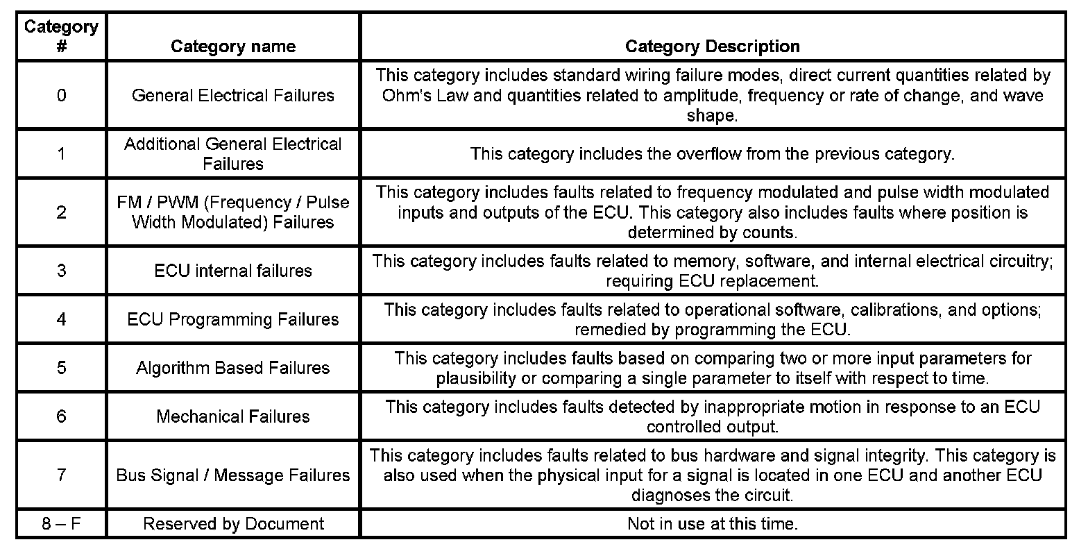 The DTC symptom is made up of 2 alphanumeric digits. The first digit following the DTC indicates the DTC symptom category. There are 16 possible categories available in the range of 0 through the letter F. Currently there are 8 categories in use, 0 through 7. These 8 categories together with their definitions are given.