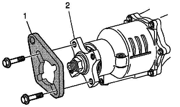 10. Install pinion flange holder J44873 (1) to the pinion flange (2) using two propeller shaft bolts.