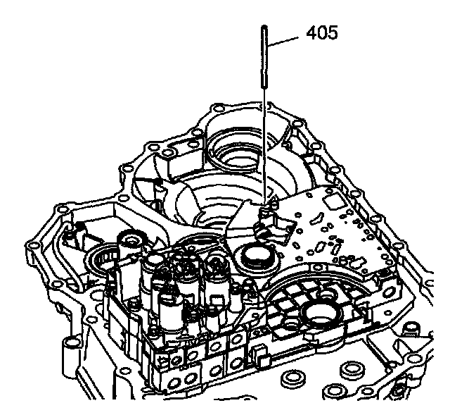 4. Insert the 7 mm x 71 mm stator shaft and torque arm, travel stop pin (405) into the hole located in the main control valve body assembly (250). Ensure that the pin bottoms out in the hole located in the torque converter housing assembly (150).