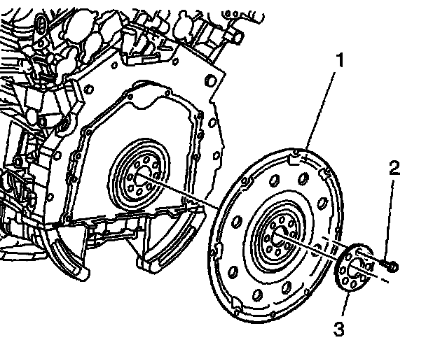 1. Position the flywheel (1) and flywheel washer (3) on the crankshaft as previously noted.