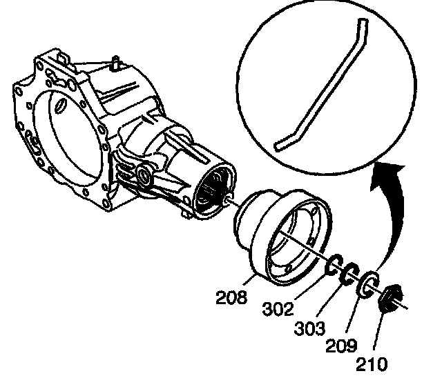 15. Remove the nut (210), washer (209), sealing washer (303), O-ring (302), and output yoke (208). Note the washer (209) installed position.