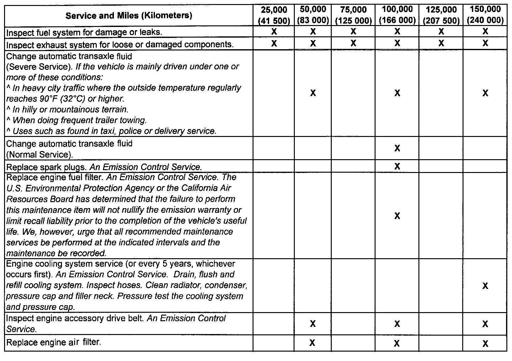 (Maintenance I or Maintenance II) after the indicated kilometers (miles) shown for each item.